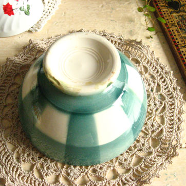 オフホワイト地にグリーンのギンガムチェック模様のカフェオレボウル。 画像のように、底に2ヶ所カケを修復した跡があります。その他は、カケ、ワレなく、アンティークのカフェオレボウルとしてはきれいでよいコンデョションです。 フランス製。