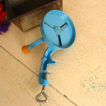 お豆をスライスする器械です。本体は加工された鋼鉄にスカイブルーのペイント、ハンドルのつまみは木製。どっしりとした重みがあります。「SPONG & CO LTD MADE IN ENGLAND NO 632 BEAN SLICER]のエンボスがあります。全体に きれいでよいコンディションです。 イギリス。