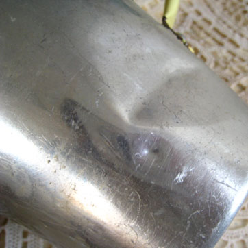 厚みのあるアルミの計量カップ。持ち手はグリーンとイエローにペイントされたブリキで しっかりと付けられています。パイントとオンスで測るようになっています。画像のように、それほど深いものではありませんが、3.5cmx4cm程度の凹み、その横にぽちっとした小さな凹みがあります。細かなキズ やわずかなヨゴレはありますが、立ちも安定しており、その他は全体に良い状態です。 イギリス製。