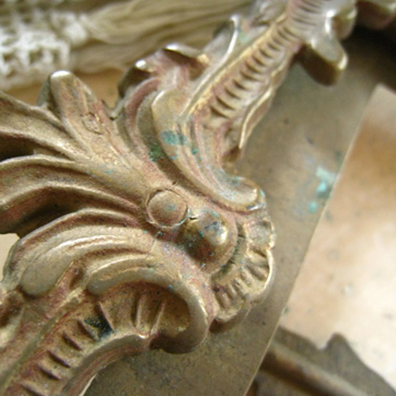 どっしりとした カストアイアンのピクチャーフレーム。フレームは優美なアールヌーボーの意匠で、燻したようなゴールドで味わいがあります。写真などを上の隙間から差し込むようになっています。ガラスや裏あてはありません。 わずかなヨゴレなどはありますが、全体によいコンディションです。 1900年代前後。 フランス製。