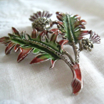 スコットランドの花、あざみの意匠のメタルブローチ。ピンク、パープル、グリーンにペイントされ、キラキラ光るマーカサイト石がはめ込まれています。グッドコンディション。イギリス製。