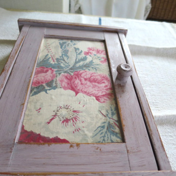 木製の鍵収納箱です。 表はアンティークの布は張られ、ラベンダーピンクにペイントされています。内部の鍵をかけるフックが6箇所。本体上部には壁にかけるビラカン2個がついています。フタ裏側にヒビがありますが、製造時からのもののようで、しっかりとはめ込まれています。全体の状態は良好です。 フランス製。