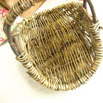 木の枝でしっかりと編まれた こぶりなカントリーバスケット。 経年によるヨゴレや若干の木の皮のキレがありますが、よい味わいがあります。 雰囲気のあるディスプレイに重宝しそうです。 ぐらつきもなく、よいコンディションです。 フランス製。