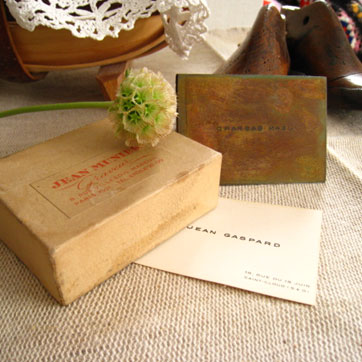中厚のペーパーボックス。名刺を印刷した時に入れられていた箱のようです。箱の上には、Graveurエッチング製版者[JEAN MUNIER]のロゴ入り。中には、「JENN GASPARD]さんの名刺6枚が入っています。オリジナル銅版付き。箱の角に若干の破れはありますが、全体によい状態です。年代を経たよい味わいがあります。 フランス製。