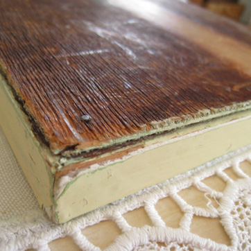 フレームがペイントされた木製のミラー。 ホワイトのペイントの上に、グリーン、ペールグリーンがペイントされ、わずかなハゲから見える何層かに塗られたペイントの配色やがシャビーなよい雰囲気を醸しだしています。とてもしっかりとしたつくりでどっしりとした重みがあります。裏側は木製ボードで、壁にかけるビラカンが取り付けられています。 鏡面に0.7ミリほどの小さななキズがありますが、わずか なものです。歪みは見られず、全体にクリアで映りがよいです。その他は全体にきれいでよいコンディションです。 フランス製。