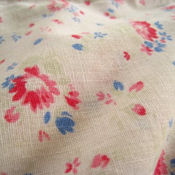 薄手で細かな織りのガーゼのような風合いのプリントファブリック。透け感があり、さらっとした手触り。 オフホワイト地に マジェンタピンクやブルーの可憐な花模様、フェードして薄いグリーン色になった葉のコントラストがよい雰囲気です。1,2箇所の極薄い小さな シミはありますが、ほとんど目立ちません。その他はきれいなコンデョションです。このタイプのファブリックで、目立つダメージやホールのないものは珍しいので大判 でのご提供とさせていただきます。フランス製。