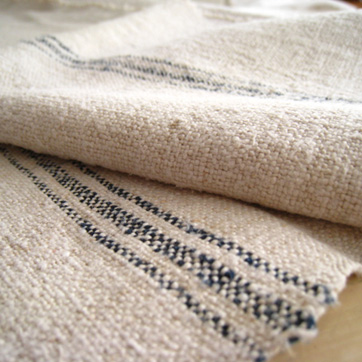 丈夫なホームスパンリネンクロスです。 生成り味のサンドベージュ地に、インディゴブルーのストライプライン。。厚手でざっくりとした織りですが、しっとりとした手触りです。上下端は切り離しで、横は生地の耳です。きれいな状態です。 ハンガリー製。