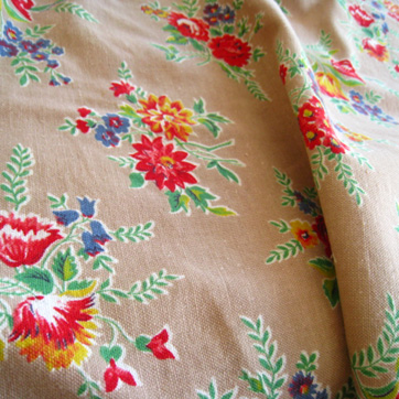 可憐な花柄模様のフレンチファブリック。中くらいの厚さで、さらっとした柔らかな手触り。 カフェオレベージュ地に 、レッド、ブルー、イエローなどの様々な花模様。ポツポツとしたグレーのヨゴレが生じている部分がありますが、極薄いものでほとんど目立ちません。 その他破れもなく、全体にきれいでよいコンディションです。フランス製。