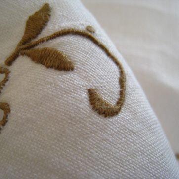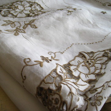 中薄ー中厚手の量感のある アイリッシュ リネンカバー。オフホワイトのネン地に光沢のあるベージューグレーの刺繍糸のマディラレースのカットワーク、フチも同色糸でフチどられています。ごく小さな織りムラ、2,3箇所のごくごくうっすらとした 薄茶のシミが生じている部分がありますが、あまり目立ちません。その他、全体にとてもきれいでよいコンディションです。 ベッドカバー、テーブルカバー、カーテンといろいろ使えそうです。イギリス製。