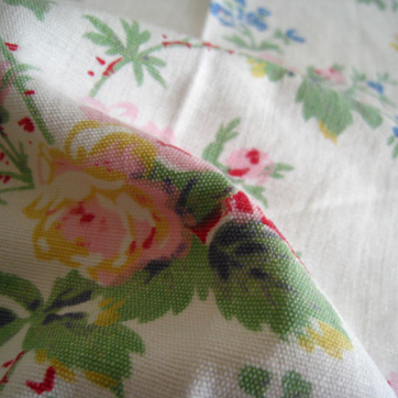 ヴィンテージのフラワーコットンプリント。人気のオフホワイト地にピンクやマジェンタ、ブルー、イエローの可憐なバラ模様。中厚でハリのあるさらっとした生地 。 特に目立つダメージはなく全体にきれいなコンデションです フランス製。