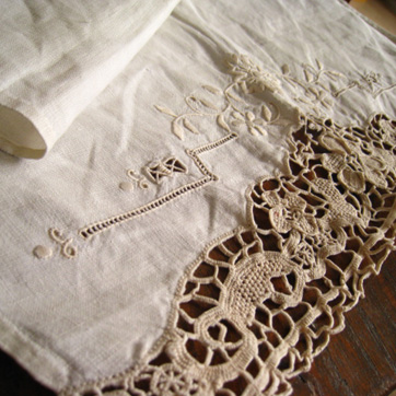 SOLD OUT [SIZE] 幅:34cm 長さ:48cm [在庫] 1 [材質] リネン、コットン(レース) [詳細] ロイヤルミルクティー色の 薄手のリネンのマット。裾にベージュ糸のニードルレースや刺繍、ドロンワークが施されています。中央上のレース部分に破れ、刺繍の上部分に一箇所程度のピリング、グレーのスポットがありますが、ごく小さいものであまり目立ちません。レースに若干の縮みはありますが、その他はその他はよいコンディションです。 イギリス製