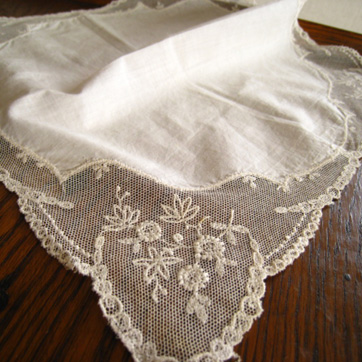 オフホワイトコットンシルクのレースハンカチーフ。とても薄手で上質で繊細な織りです。とてもなめらかで、やわらか 、手に馴染む手触りです。 まわりには繊細なネットレース刺繍レースが施され、とても優美な印象です。本体に、ハリを抜いた跡、ごく小さな薄茶のスポットがありますが、とても小さく、ほとんど目立ちません。その他は全体 にとてもきれいでよいコンディションです。イギリス製。