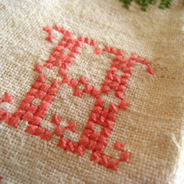 生成り味のベージュ地に、ピンクのバラにグリーンの葉と茎模様のクロスステッチ刺繍。モノグラムは[HM]。中くらいの厚さでヘンプ混じりの織りですが、比較的しなやかで、