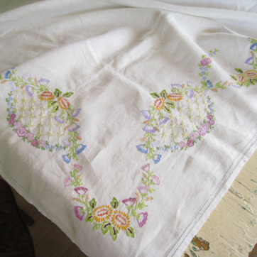 光沢のあるアイリッシュリネンの刺繍テーブルクロス。比較的ざっくりめで、中厚のホワイト地にやさしい色合いのパステルカラーの花模様刺繍が可憐な上品な印象です。 適度なハリとしっとりとしたやわらかさがあり、手になじみます。フチにドロンワークが施されています。1、2ヵ所、ごく小さな薄茶のシミはありますが、 ほとんど目立ちません。その他は、全体に とてもきれいなコンデションです 。 イギリス製。