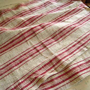 SOLD OUT [SIZE] 約 横:37 縦:117cm [在庫] 1 [材質] リネン [詳細] 中くらいの厚さのリネンファブリック。 濃い目の生成り地に、全体にえんじのストライプ模様です。ヘンプまじりで、ざらっとした手触りですが、適度なしなやかさがあります。独特の織りムラやネップが特徴的な雰囲気をかもし出しています。若干のポツポツとした薄茶のヨゴレのほか、上部10cm ほどうっすらとしたグレーのヨゴレがありますがカットせずのそのままにしてあります。その他は、全体によい状態です。 フランス製。