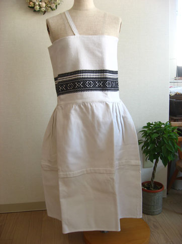 ホームスパンンコットンのアンダードレス。ハンドメイドでとてもていねいに作られています。 ウエストの黒いマシン刺繍が特徴です。東欧ぽい模様がおしゃれです。ホームスパンでざっくりした厚手の生地 ですが、コットンですので、着心地はよいです。 オリジナルは、一本の肩ヒモを肩にかけて回し、後ろで結んで着用しますが、お好みで、ヒモを付け替えて、キャミソールドレスのように着用してもいいと思います。全体に きれいでよい状態です。 1900年前後ごろ。チェコ製。