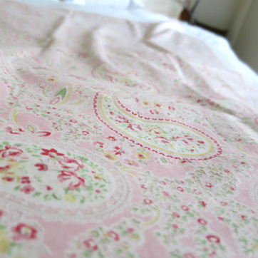 中薄で細かな上質な織りの花柄プリント。なめらかな手触り。明るいピンク地にバラや小花のペーズリー模様です。キルトカバーをほどいたものなので、糸を抜いた跡や裏側にわずかな羽毛が残っていますおり、中央に一箇所程度の小さなホールがありますがが、その他は全体に発色がよく、きれいでよいコンディションです。イギリス製。 |