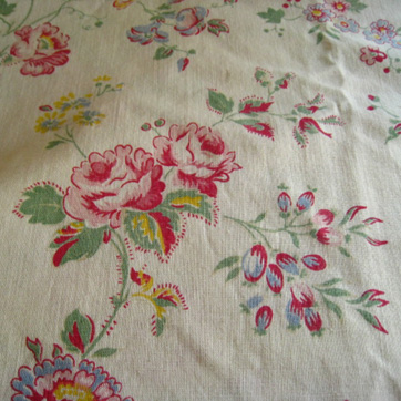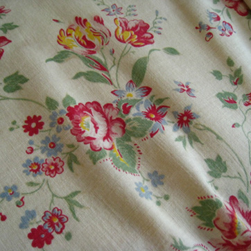 中薄でさらっとした手触りの大判サイズのプリントファブリック。 クリームベージュ地にマジェンタピンクやレッド、ブルー、イエローの 花模様です。いくつもの違うパターンの花束模様が描かれています。適度なやわらかさがあります。所々色が褪せている部分や、ごく小さな目立たないヨゴレが数箇所ありますが、全体にきれいでよいコンデョションです。 下の画像はカット前のものになります。 フランス製。