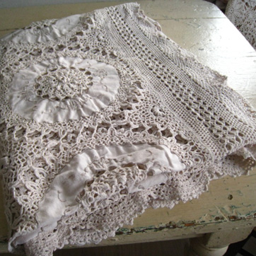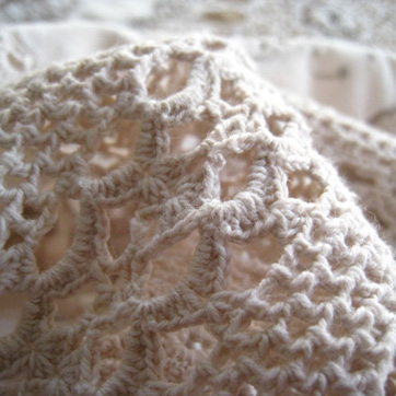 コットンレースカバー。オフホワイトコットンの布帛に、たっぷりのクロシェレース、刺繍が施された、丸円のモチーフに、端にはたっぷりとした、ティーブラウンベージュ色のクロシェレースが施されています。ピュアホワイトの、上質な薄手リネンテーブルセンター。