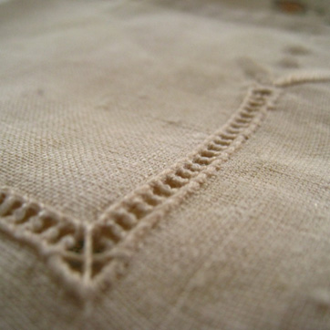 暖かみのあるクリームベージュのアイリッシュリネンのカバー。中くらいの厚さで、適度なハリとしなやかさ、ツヤがあります。両側は袋縫いで仕上げられ、上部はドロンワーク、下部はたっぷりとした、コットンのニードルレース、布帛には、刺繍やカットワーク、ドロンワークが施されています。左上に、経年による薄茶のスポッツが数箇所ありますが、その他 は、全体にきれいなコンディションです。イギリス製。