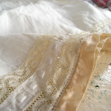 とても細かで上質な織りの薄手コットンリネンのレース付布。インナーズボンの片方だったと思われます。暖かみのある オフホワイトの布はくに、ツヤのあるピンクベージュのヘム、クリームベージュのレース、ノット刺繍の繊細 な飾りつき。上部にはリネンテープが残っています。縫い合わせ部分の若干のヨゴレなどはありますが、全体にきれいなコンディションです。フランス製。