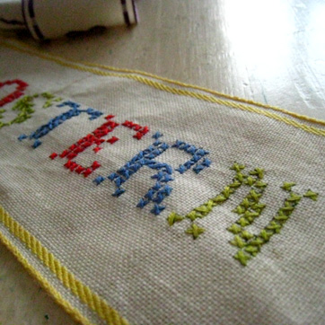 リネンの装飾リボン。生成りベージュ地にイエローのライン、クロスステッチでウサギの刺繍と、「FROHE」[OSTERN」(復活祭おめでとうございます)の文字の刺繍が施されています。粗めの織りでツヤがあり、適度なハリとしなやかさがあります。きれいでよいコンディションです。 ドイツ製。