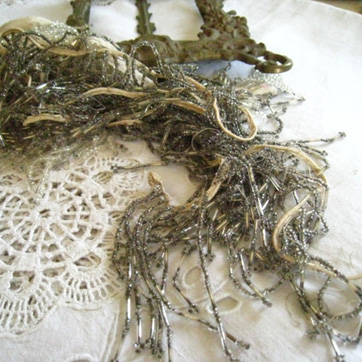 生成りシルクテープリボンにつけられた、キラキラ輝く細かな透明感のあるグレービーズのフリンジトリム。テープの両端は切り離し。たっぷりサイズで、どっしりと量感があります。ランプシェードや洋服のパーツなど幅広くアレンジできそうです。全体にきれいでよいコンディションです。 1900年はじめごろ。 イギリス製。