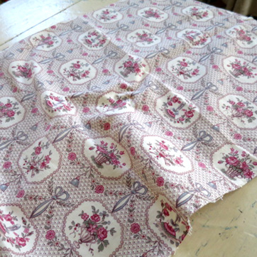 中厚でさらりとした手触りのプリントファブリック。 クリームホワイト地リボンやバラの優美な模様。 カルトナージュを作るのにも最適です。特に目立つダメージはなく、とてもきれいでよいコンデョションです。 フランス製。