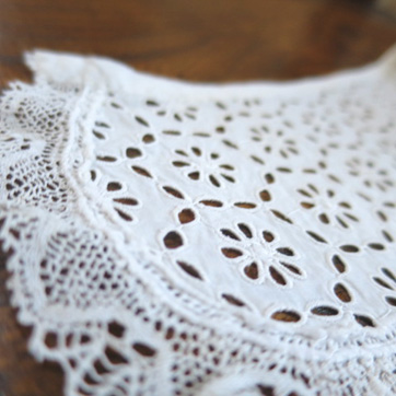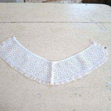 薄手のコットンリネンのレースカラー。ハンドメイドで丁寧に作られています。2箇所ほどキレを修復した跡がありますが、その他はきれいでよいコンデョションです。 フランス製。
