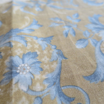 オフホワイト地に優雅なブルーのローズ柄。マスタードイエロー地にブルーグレーの草花模様の布は若干薄手です。数箇所のポツポツとしたピンホールはありますが、その他は全体によいコンディションです。1900年前後。フランス製。 |
