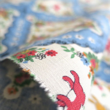 SOLD OUT [SIZE] 85x50cm [在庫] 1 [材質] コットン [詳細] 中薄でさらりとした手触りのプリント。ホワイトとブルーの地に花柄やかわいらしいうさぎの模様です。とてもきれいでよいコンディションです。フランス製。