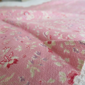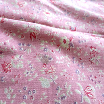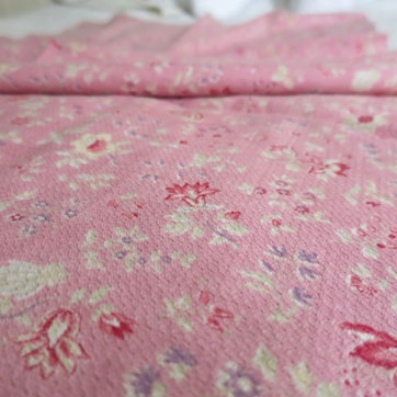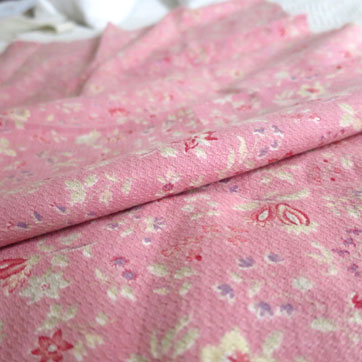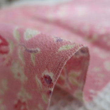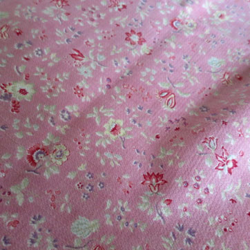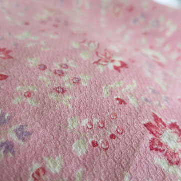 中厚でさらりとした、しなやかな風合いのプリントファブリック。サーモンピンク地に小花模様。 ちりめんのような起伏のある特徴の織りです。3cm程度の小さなヨゴレがあるほかは全体にきれいでよいコンディションです。イギリス製。