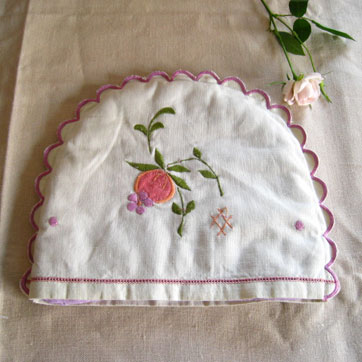 クリームベージュのコットンリネンに花模様のコットン刺繍のティーコジー。内側はラベンダー色の綿入りサテン生地 で、ポットを暖めてくれます。フチのシェルレース刺繍やドロンワークもキュートです。バッグなどにリメークしてもグッド。よいコンデョションです。 フランス製。