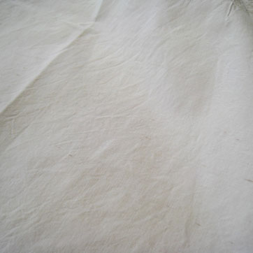 前身ごろは胸上、後ろ身ごろは首下の長さになっています。ヒモは前後切り離しになっており、結ぶようになっています。前身ごろにカスったようなプチプチとした茶のヨゴレが数箇所ありますが、ごく小さいものです。後ろ身ごろと前身ごろの下のほうに、それぞれ薄いオレンジ色の小さなスポットがありますが、あまり目立ちません。
