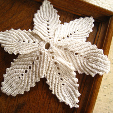 光沢のある中太のオフホワイトコットン糸で編まれたエレガントなクロシェ花型モチーフのオブジェ。とても雰囲気のある品です。キャンドルホルダーということですが、使用の形跡はありません。全体にとてもきれいでグッドコンデョションです。 イギリス製。