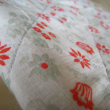 2枚仕立てのフラワープリントのテーブルマット。表面の生地は、ミントグリーン味のホワイト地に、朱色レッドとグリーンの小花模様。ごく薄手でさらっとしたガーゼのような繊細な生地で、中に心地として厚手の布がはいっているようで、厚みがあり、丈夫です。数箇所の糸のホツレのほか、ごく薄いシミヨゴレが数箇所ありますが、破れのようなものは見当たりません。その他は全体に よいコンデョションです。 フランス製。