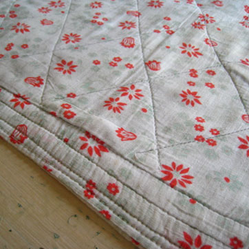 SOLD OUT [SIZE] 横:41 cm 縦:33 cm [在庫] 1 [材質] コットン [詳細] 2枚仕立てのフラワープリントのテーブルマット。表面の生地は、ミントグリーン味のホワイト地に、朱色レッドとグリーンの小花模様。ごく薄手でさらっとしたガーゼのような繊細な生地で、中に心地として厚手の布がはいっているようで、厚みがあり、丈夫です。数箇所の糸のホツレのほか、ごく薄いシミヨゴレが数箇所ありますが、破れのようなものは見当たりません。その他は全体に よいコンデョションです。 フランス製。