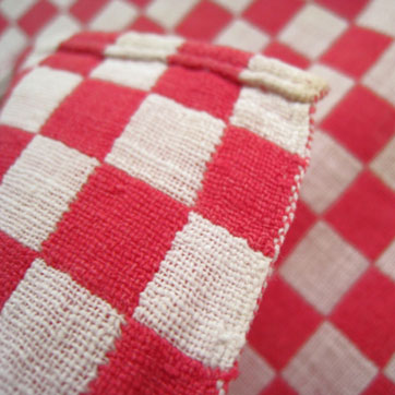 ホワイトとレッッドのチェック模様のフランスらしい伝統的なコットンマットです。レッドの裏は白、白の下は レッド、と2枚重ねで縫われており、 厚みがあります。厚手ですが、ガーゼのような柔らかな手触りです。 フチもしっかりと縫われています。 数箇所、下地の糸が出ている部分、うっすらとした茶のシミがある部分がありますがそれほど 濃くはありません。保管状態もよく、その他は全体に良好なコンディションです。 「9661」は「9660」より全体に若干、色が薄めです。フランス製。