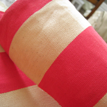 未使用デッドストックの厚手コットンファブリック 。 デッキチェアなどに使われるとても丈夫でしっかりとしたキャンパス布地です。明るい生成りベージュ地に画像よりは若干深い濃い目の赤のストライプ模様。鮮やかな色合いで、とてもきれいでよいコンディションです。フランス製。 ロール状態でのお届けがご希望の場合は、その旨ご指定ください。(本体 直径:5cm 長さ45cm)。それ以外は、折り畳んでのお届けになります。いろいろな用途に使えそうです。