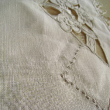ハンドメイドで、フチに凝ったコットンのボビンレース、カットワーク、フレンチノットがとても丁寧に施され、エレガントです。2.5cmほどのペンでなぞったような青い線状のヨゴレ、ごく薄い小さなシミがありますが、