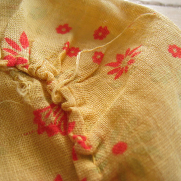 もとはカラフルな花柄だったと思われ、色あせて、レッドの部分のみが残っています。35x30cmの本体に6cm幅のギャザーが手縫いで縫われています。縫い目のほつれや、4、5箇所ほどの破れやホールがあり、5,6箇所の薄茶のホール状のヨゴレがありますが、いずれも端の方です。その他、本体にポツポツとした点状のシミがありますが、ごくごく小さいものです。古い布の味わい深いよい雰囲気があります。フランス製。 |