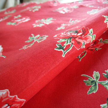 デッドストック未使用の花柄プリントファブリック。スカーレットレッド地に、赤いバラ、つぼみ柄のモチーフです。薄手で細かな織りの上質な生地で、適度な光沢があります。さらりとした手触り。とてもきれいなコンディション。フランス製。