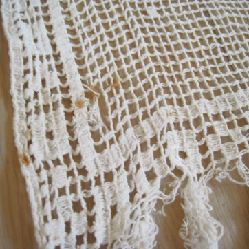 優美で凝ったモチーフのフィレレースのコットンカーテン布。 孔雀と花の模様です。オフホワイトでさらりとした手触り。 上端は2cmほど折り返し縫いされており、下部は6cmほどのフリンジになっています。一箇所程度のレースの小さな破れ、2,3箇所のフリンジの抜け、数箇所の極薄いオレンジのシミはありますが、その他は全体にきれいなンディションです。 イギリス製。